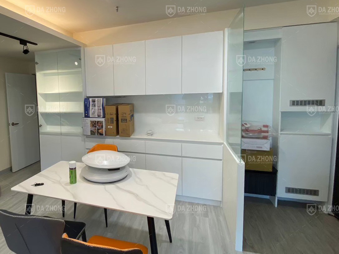 ⏺︎ L型廚具配置,搭配白色烤漆門片與人造石檯面,讓小空間也能延展出寬敞感。